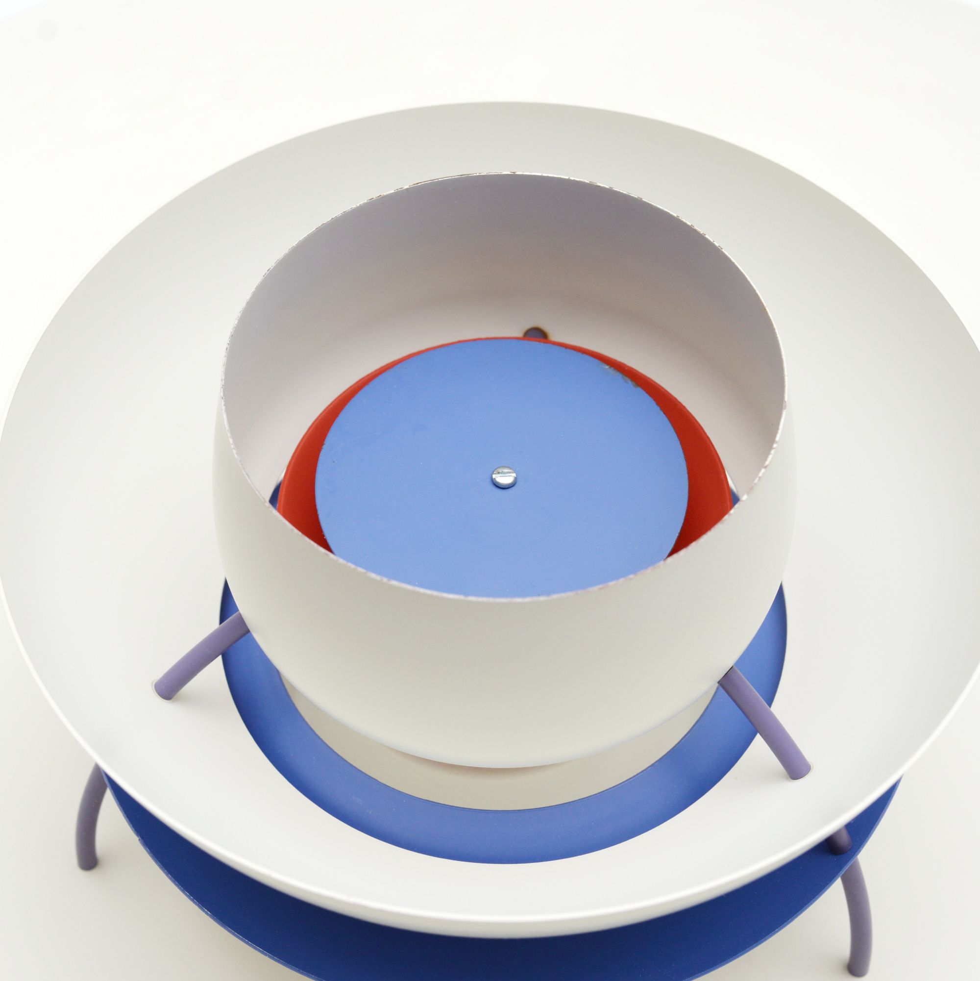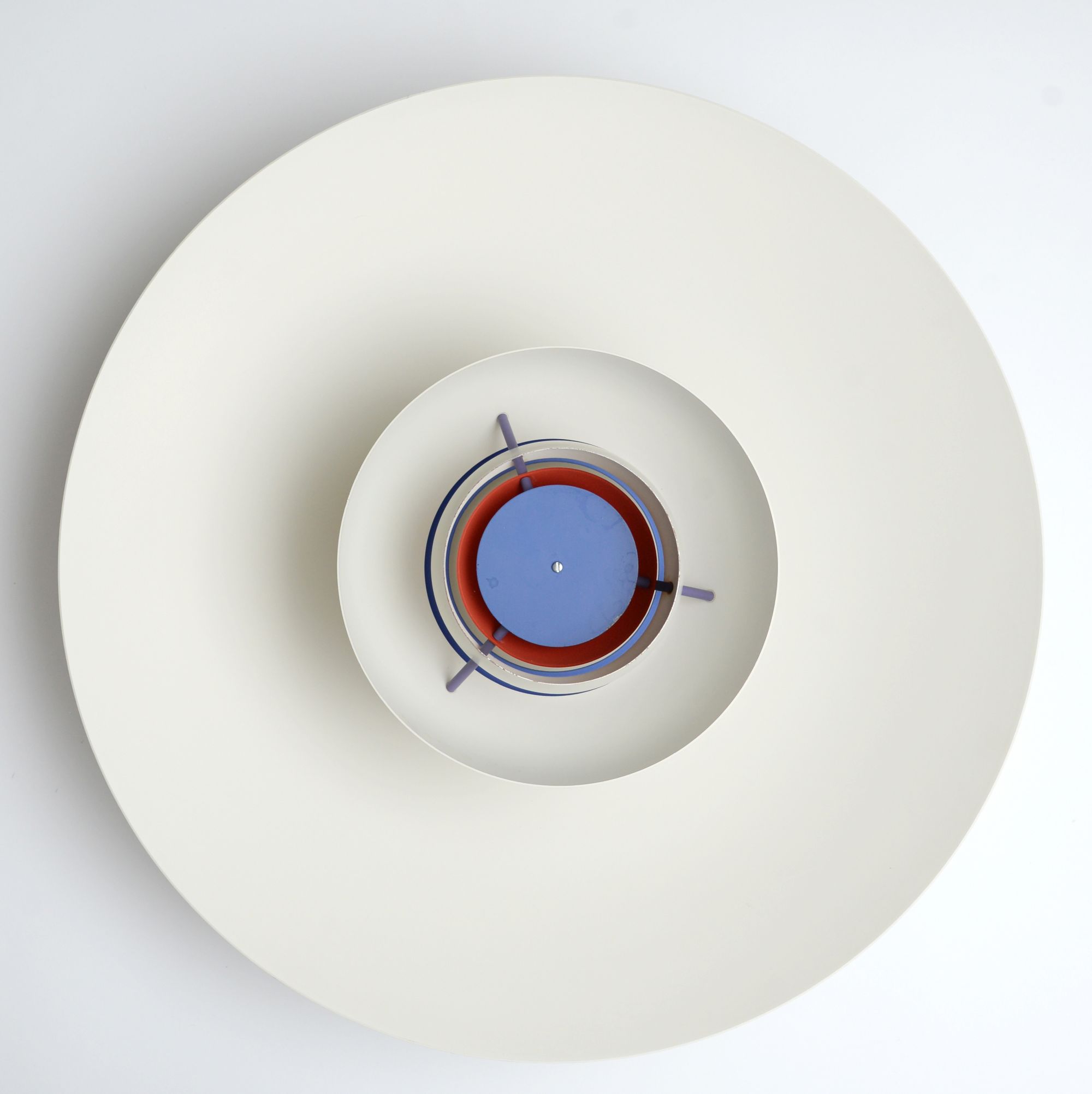 Lampa PH5 projektu P. Henningsena z 1958 roku dla Louis Poulsen, lata 80-90’te. Niezwykła forma zachwyca lekkością projektu- nie bez powodu stała się ikoną oświetleniowego designu. Lampa zaprojektowana w oparciu o zasadę odblaskowego układu czterech odcieni, który kieruje światło nie tylko w dół, ale i również na boki, tym samym oświetlając samą lampę. Charakterystyczną cechą lamp Henningsena jest delikatne światło rozproszone, ukierunkowane w dół- nie oślepiające odbiorcy, pozwalające również podziwiać samą lampę z każdej perspektywy. Model wyposażony w blendę tłumiącą światło od spodu. Kolor oryginalny biały wpadający w beż- lampa nie jest pożółkła.